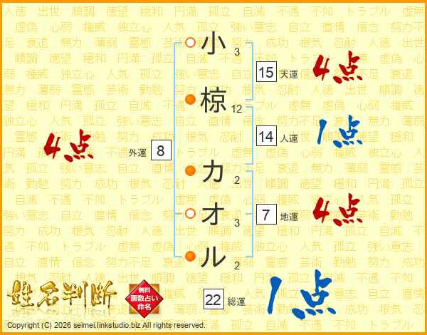 小(3画)椋(12画) カ(2画)オ(3画)ル(2画)