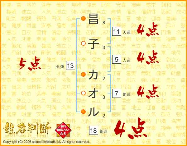 昌(8画)子(3画) カ(2画)オ(3画)ル(2画)