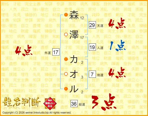 森(12画)澤(17画) カ(2画)オ(3画)ル(2画)