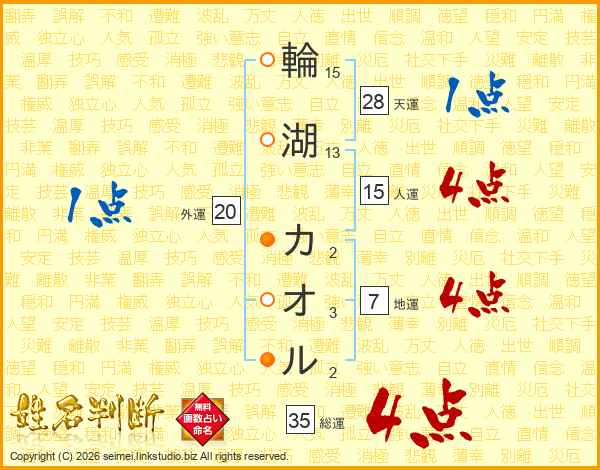 輪(15画)湖(13画) カ(2画)オ(3画)ル(2画)
