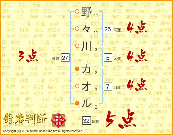 野々川カオルさんの総運は32画の5点!