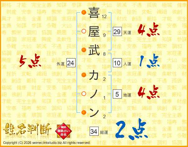 喜(12画)屋(9画)武(8画) カ(2画)ノ(1画)ン(2画)