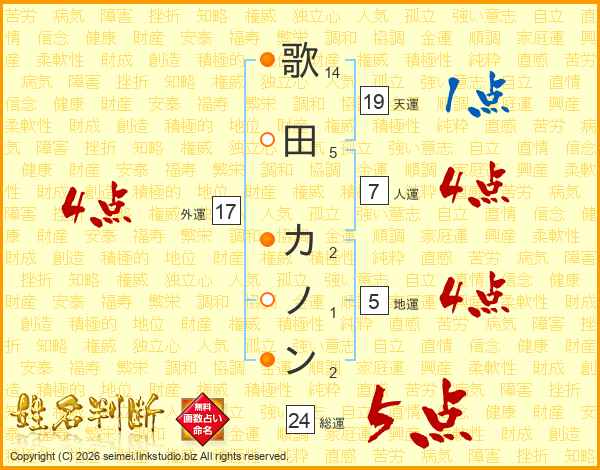 歌(14画)田(5画) カ(2画)ノ(1画)ン(2画)