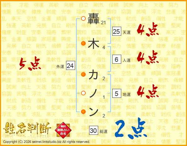 轟(21画)木(4画) カ(2画)ノ(1画)ン(2画)