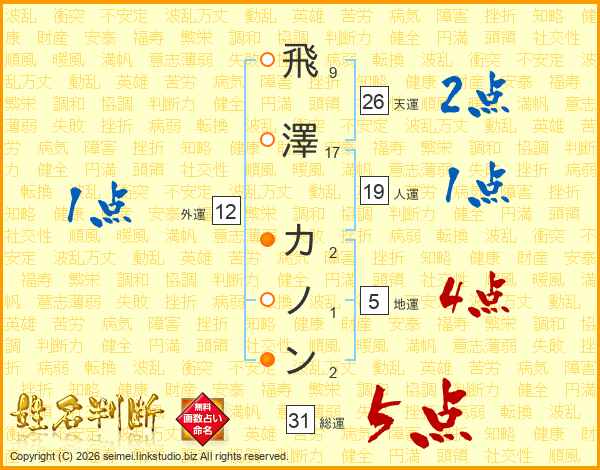 飛(9画)澤(17画) カ(2画)ノ(1画)ン(2画)