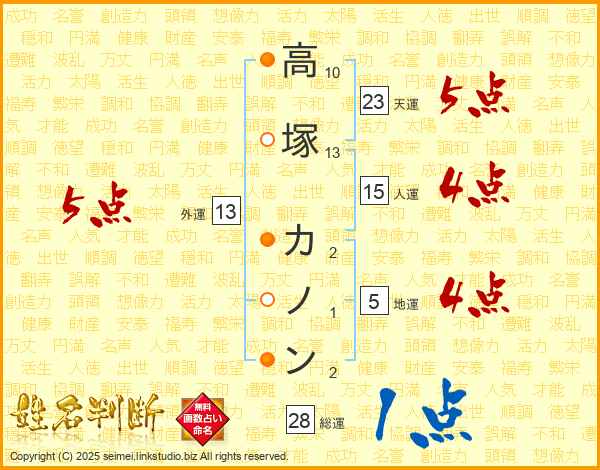 高(10画)塚(13画) カ(2画)ノ(1画)ン(2画)