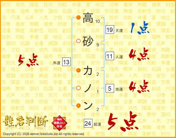 高砂カノンさんの総運は24画の5点!