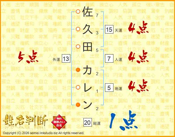 佐(7画)久(3画)田(5画) カ(2画)レ(1画)ン(2画)