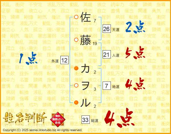 佐(7画)藤(19画) カ(2画)ヲ(3画)ル(2画)