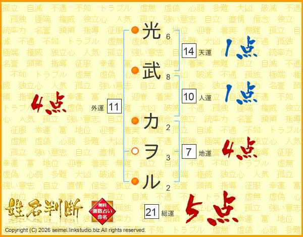 光(6画)武(8画) カ(2画)ヲ(3画)ル(2画)