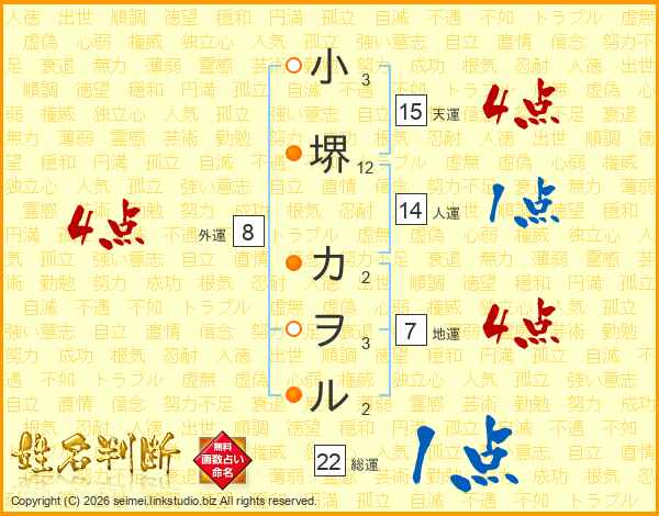 生活面を象徴する運勢です。外部から受ける影響力を表し、結婚運、家庭運や職場、環境への順応性を表します。総運から人運を引いた画数。姓や名が1文字の場合を除く。