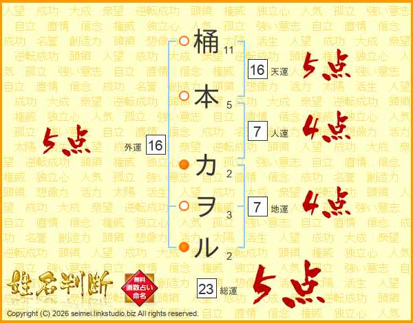 あなたの人生を表す1番重要な運勢です。生涯を通じて影響する総合運となり、主に50歳以降の晩年期に影響を及ぼします。苗字と名前の合計画数。