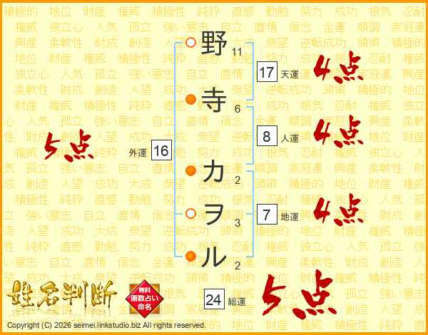 野(11画)寺(6画) カ(2画)ヲ(3画)ル(2画)