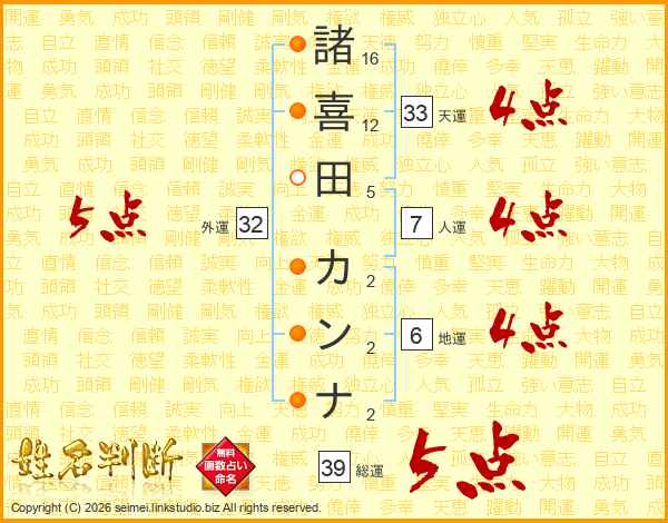 諸(16画)喜(12画)田(5画) カ(2画)ン(2画)ナ(2画)