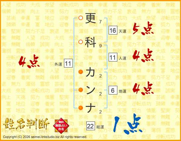 更(7画)科(9画) カ(2画)ン(2画)ナ(2画)