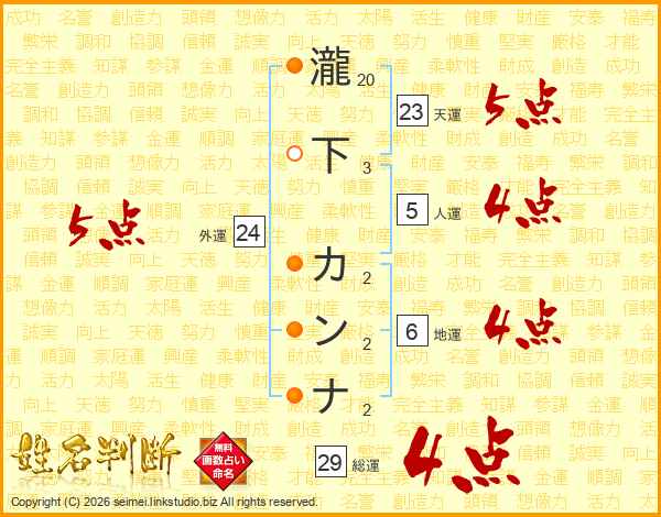 瀧(20画)下(3画) カ(2画)ン(2画)ナ(2画)