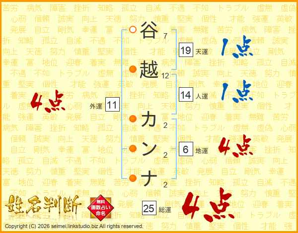 谷(7画)越(12画) カ(2画)ン(2画)ナ(2画)