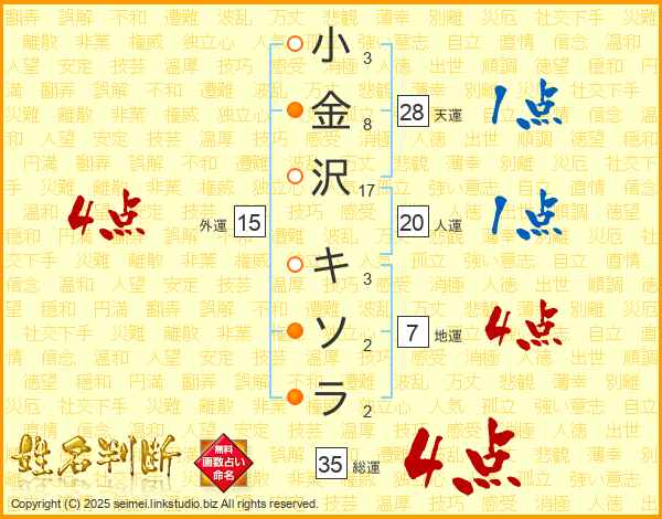 小(3画)金(8画)沢(17画) キ(3画)ソ(2画)ラ(2画)
