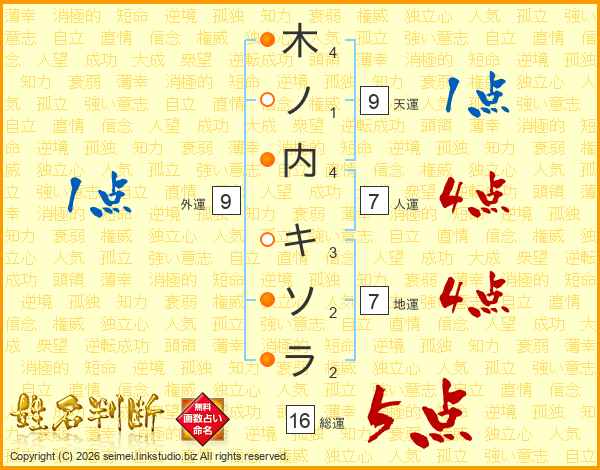 木(4画)ノ(1画)内(4画) キ(3画)ソ(2画)ラ(2画)