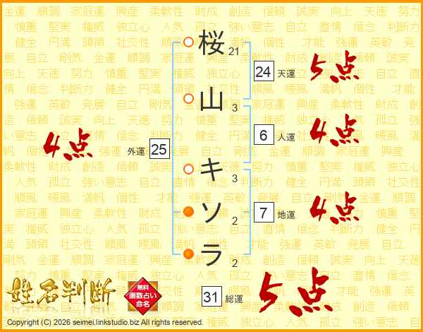桜(21画)山(3画) キ(3画)ソ(2画)ラ(2画)