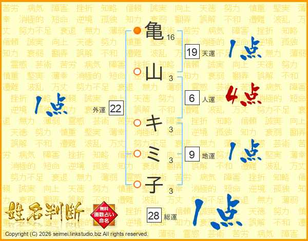 亀山キミ子さんの外運は22画の1点!