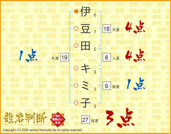 伊豆田キミ子さんの総運は27画の3点!