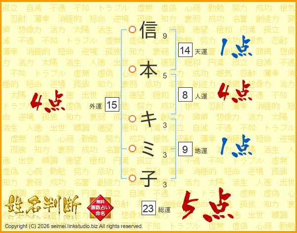 信本キミ子さんの総運は23画の5点!