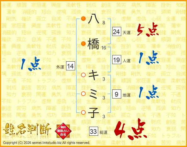 八橋キミ子さんの総運は33画の4点!
