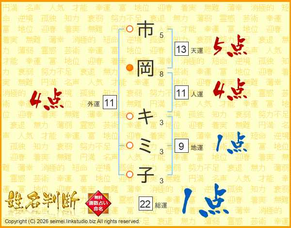 市(5画)岡(8画) キ(3画)ミ(3画)子(3画)