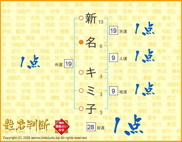 新(13画)名(6画) キ(3画)ミ(3画)子(3画)