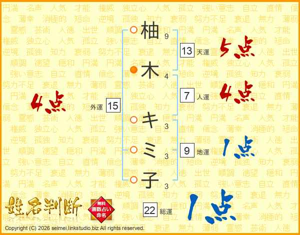 柚(9画)木(4画) キ(3画)ミ(3画)子(3画)