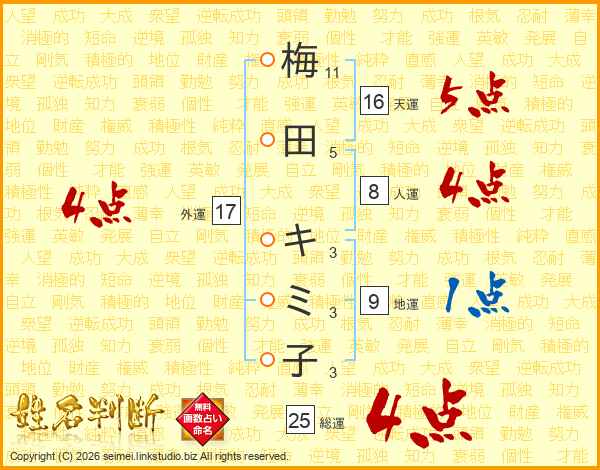 梅田キミ子さんの総運は25画の4点!