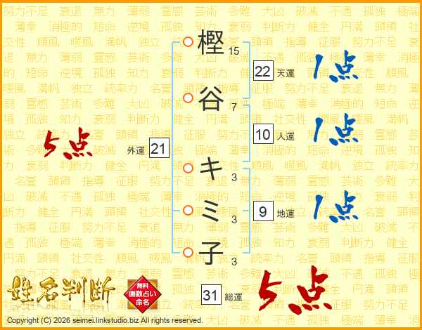 樫谷キミ子さんの総運は31画の5点!