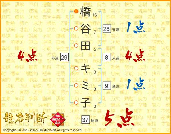 橋谷田キミ子さんの総運は37画の5点!