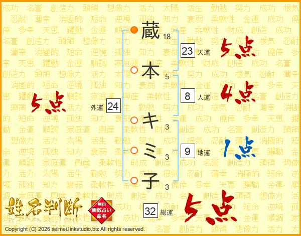 蔵本キミ子さんの総運は32画の5点!