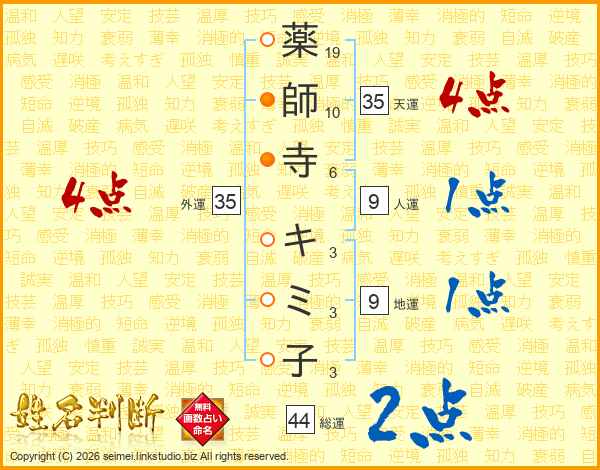 薬(19画)師(10画)寺(6画) キ(3画)ミ(3画)子(3画)