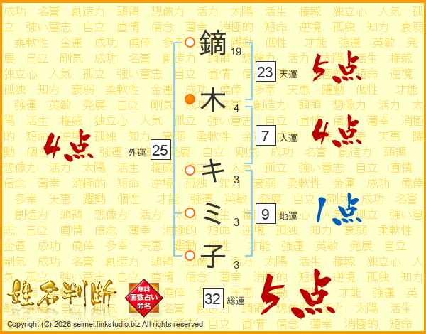 鏑(19画)木(4画) キ(3画)ミ(3画)子(3画)