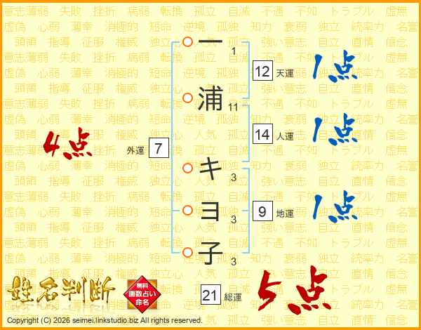 一(1画)浦(11画) キ(3画)ヨ(3画)子(3画)