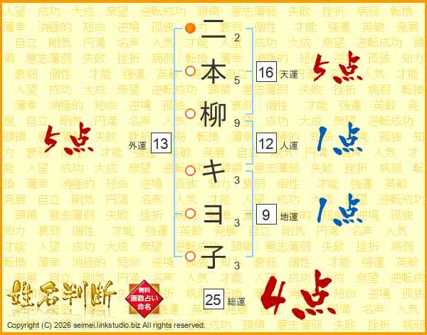 二本柳キヨ子さんの総運は25画の4点!