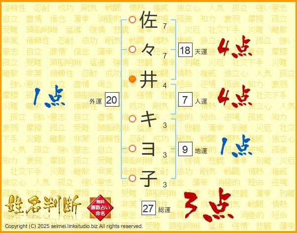 佐(7画)々(7画)井(4画) キ(3画)ヨ(3画)子(3画)