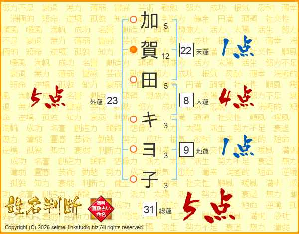 加(5画)賀(12画)田(5画) キ(3画)ヨ(3画)子(3画)