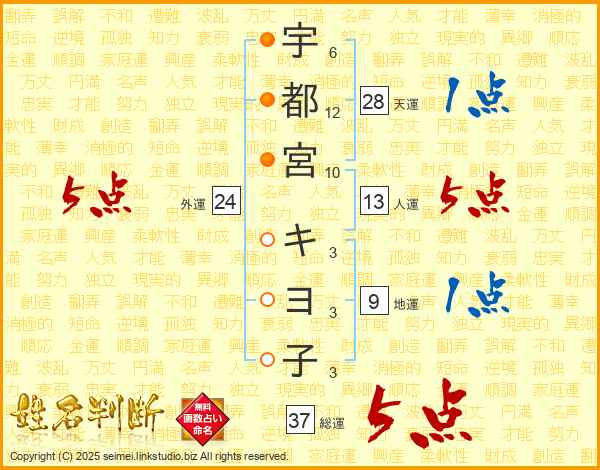 宇(6画)都(12画)宮(10画) キ(3画)ヨ(3画)子(3画)