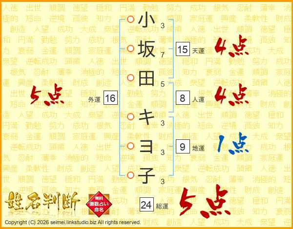 小坂田キヨ子さんの総運は24画の5点!