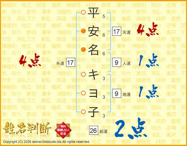 平(5画)安(6画)名(6画) キ(3画)ヨ(3画)子(3画)