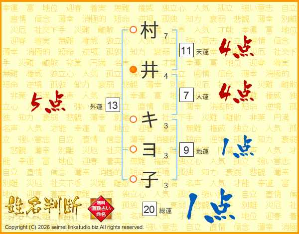 村(7画)井(4画) キ(3画)ヨ(3画)子(3画)