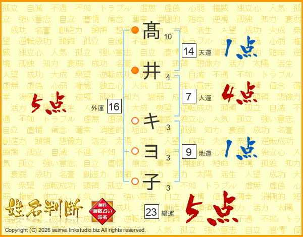 髙井キヨ子さんの総運は23画の5点!