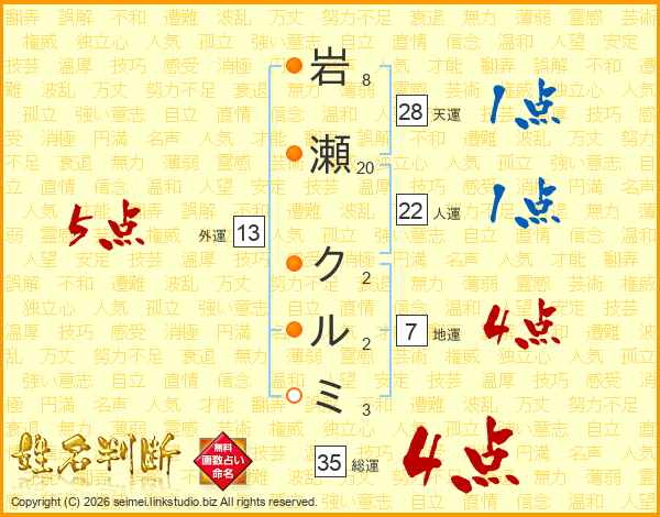 岩瀬クルミさんの総運は35画の4点!