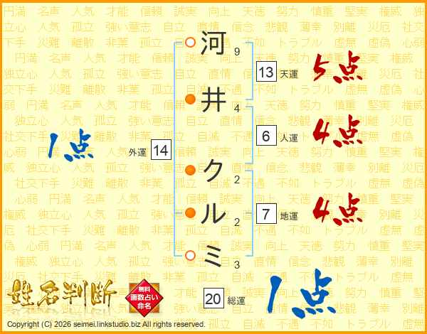 生活面を象徴する運勢です。外部から受ける影響力を表し、結婚運、家庭運や職場、環境への順応性を表します。総運から人運を引いた画数。姓や名が1文字の場合を除く。