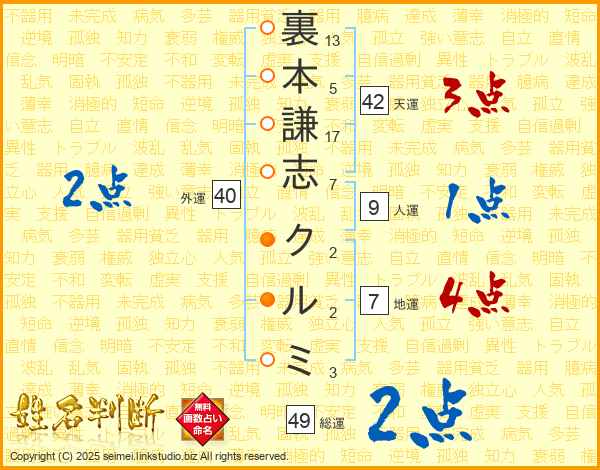 裏本謙志クルミさんの総運は49画の2点!
