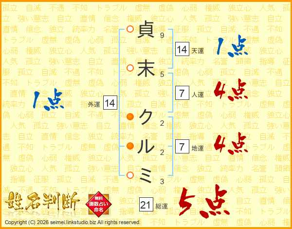 貞末クルミさんの総運は21画の5点!